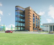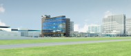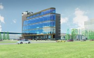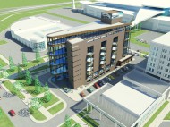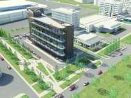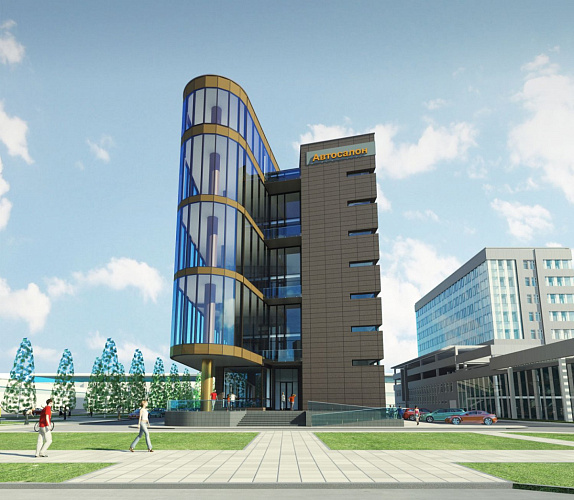 Участок проектирования, имеющий прямоугольную форму, выходит короткой стороной на городскую магистраль – ул. Конева. Типология здания обусловила острое объёмно-планировочное решение в виде взаимопересечения двух объёмов – треугольного стеклянного и прямоугольного , условно, глухого. На пяти уровнях здания размещаются шоу-румы автомобильной техники различных брендов. Запроектированы сопутствующие помещения (ресторан, бары, комнаты переговоров), превращающие выставочный комплекс в центр общения людей, интересующимися новинками авторынка, экспертов, специалистов по продажам.